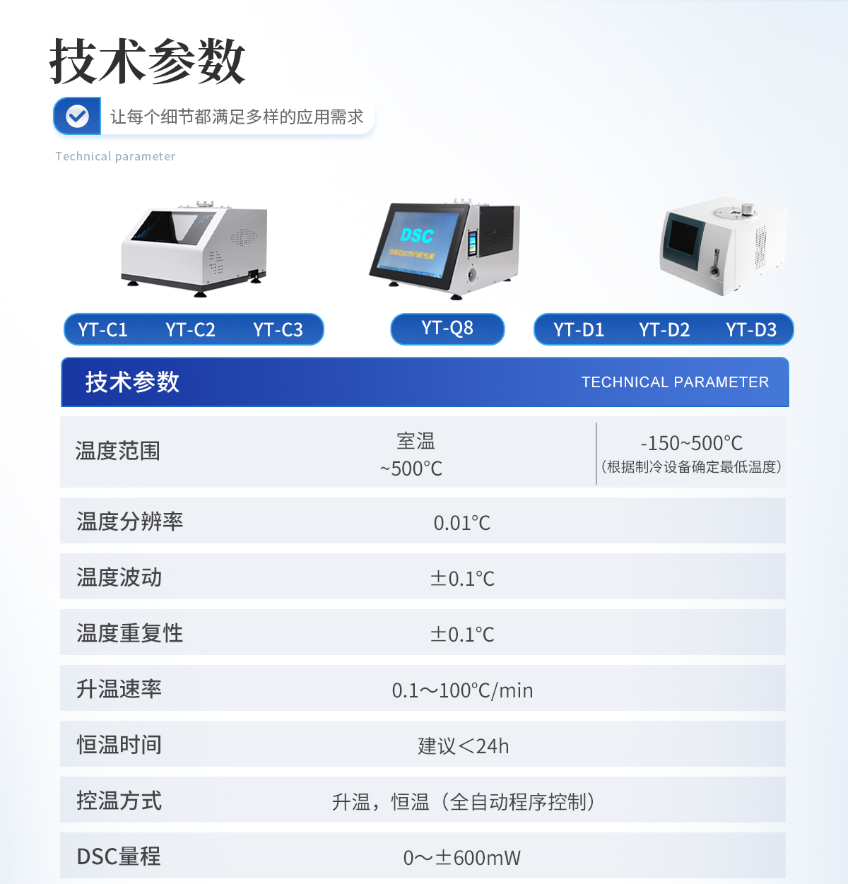 1.溫度范圍: 室溫~500℃ 2.溫度分辨率: 0.01℃ 3.溫度波動: ±0.1℃ 4.溫度重復性: ±0.1℃ 5.升溫速率: 0.1~100℃/min 6.恒溫時間:建議<24h 7.控溫方式:升溫,恒溫(全自動程序控制) 8.DSC量程: 0~±600mW 9.DSC解析度: 0.01mW 10.DSC靈敏度: 0.01mW 11.工作電源: AC220V/50Hz或定制 12. 氣氛控制氣體:氮氣、氧氣(儀器自動切換) 13.氣體流量:0-300mL/min 14.氣體壓力:0.2MPa 15.顯示方式: 8寸 LCD觸摸屏顯示,超硬度儀器面膜設計。