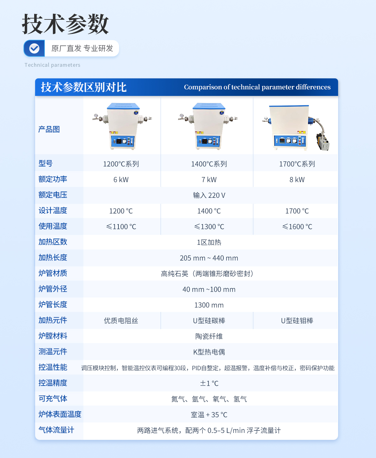 | **溫度:1700℃ | 常用使用溫度:1550℃以下 | 加熱元件:硅鉬棒 | 加熱方式:雙面加熱 | 熱電偶:B 型 | 控溫**度:±1℃ | 工作電壓:220V/8KW | 外觀設(shè)計:電爐采用人性化設(shè)計,美觀大方,操作簡單,外層漆層使用噴塑高 溫烘烤工藝。有耐高溫耐氧化,耐酸堿能力。 | 殼體設(shè)計:電爐殼體采用雙層強(qiáng)制風(fēng)冷構(gòu)造,使電爐在高溫度時爐殼外部溫度 接近室溫,避免了意外傷害發(fā)生。 | 爐膛結(jié)構(gòu):一體化緊湊設(shè)計,臺階式拼接結(jié)構(gòu),符合力學(xué)定律,加熱時受力均 勻,保障了熱能不易散失,延長了爐膛使用壽命。 | 爐膛材質(zhì):爐膛材質(zhì)采用**的輕質(zhì)氧化鋁陶瓷纖維,具有保溫效果優(yōu)良,質(zhì)輕耐高溫,耐極冷極熱,不易裂縫,不易結(jié)晶,不易掉渣,不用擔(dān) 心污染所燒制產(chǎn)品。節(jié)能效果是老式電爐的 60%-80%。 | 溫度控制:采用國內(nèi)宇電儀表廠家的智能控溫儀表,可設(shè)定 30段智能可編程PID自整定,一鍵操作, 自動升溫, 自動降溫,無需守值,操作簡單方 便。 | 升溫速率:0--20℃/min 任意設(shè)定,建議≦10℃/min | 安全保護(hù):電爐采用集成化電路,模塊控制.(具有偏溫保護(hù)、超溫保護(hù)、斷偶 保護(hù)、超流保護(hù)、等保護(hù)功能)使電爐工作穩(wěn)定可靠安全。 | 可通氣體:所有惰性氣體,混合氣體,氮?dú)?、氧氣、一氧化碳、氬氣等?/td> | 氣體控制:進(jìn)氣端可設(shè)置 1 或多個進(jìn)氣口,每個進(jìn)氣口均設(shè)有針閥,連接真空表一個。出氣端連接出氣孔一個,抽真孔一個,所有孔均設(shè)針閥。 配備真空泵一臺。 | 密封方式:采用 304 不銹鋼法蘭,具有裝卸方便,抗氧化,抗酸堿,雙層密封,保證了密封性。 | 保修期:爐體保修一年(加熱體易損件除外),終身維護(hù) | 標(biāo)準(zhǔn)配件:真空泵一臺、坩堝勾 1 把,防高溫手套 1 雙,使用說明書 1 份,合 格證,保修卡。 | 產(chǎn)品認(rèn)證:本產(chǎn)品通過歐盟標(biāo)準(zhǔn) CE 認(rèn)證 ISO 9001:2015 質(zhì)量管理體系認(rèn)證 | 包裝:出口木箱包裝并且內(nèi)有發(fā)泡沫填充,塑料薄膜包裹爐體。 |