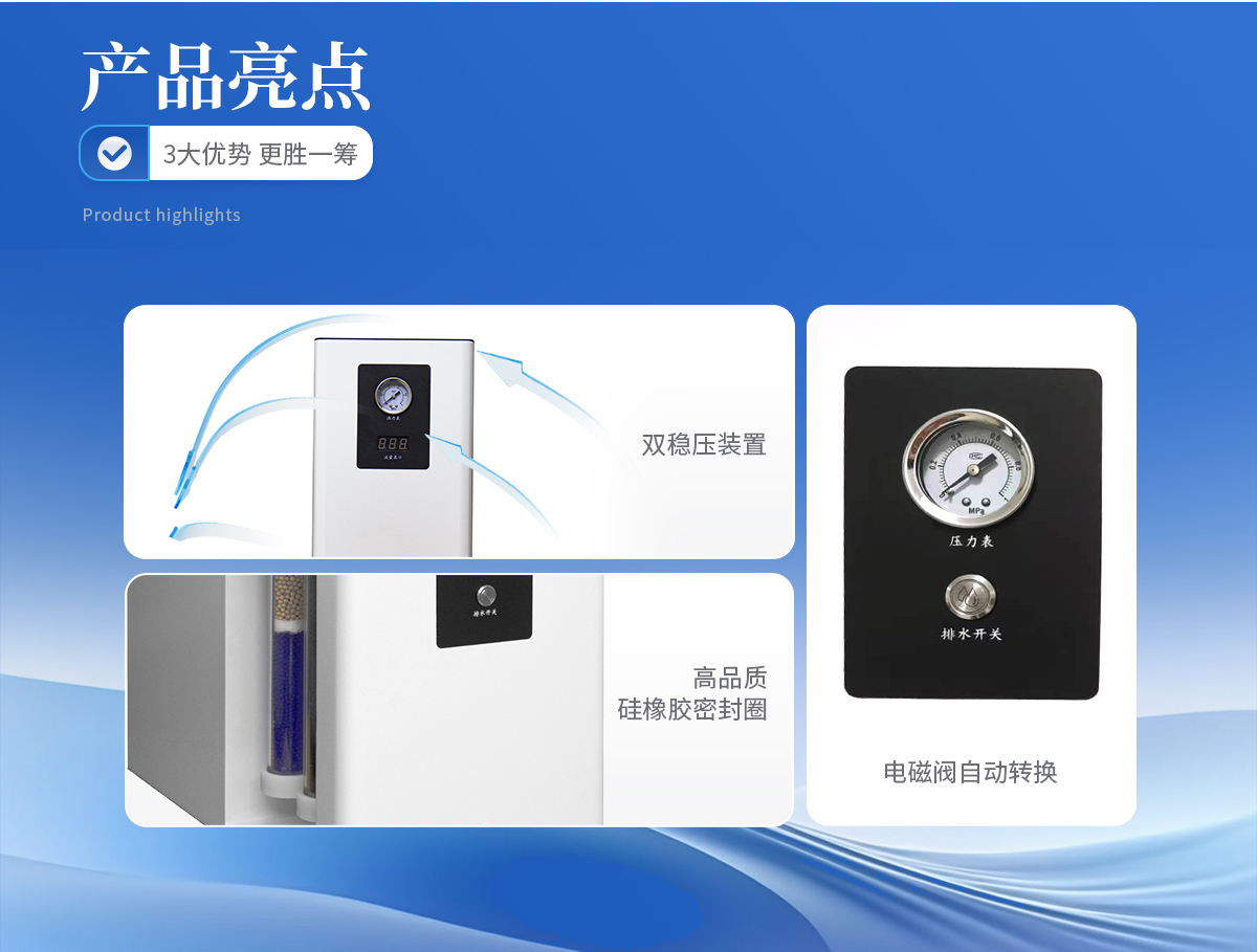 1、雙穩(wěn)壓裝置,確保高精度穩(wěn)壓條件下氣體流量的穩(wěn)定性。 2、電磁閥自動(dòng)轉(zhuǎn)換,徹底杜絕了電磁閥在自動(dòng)放水時(shí)產(chǎn)生的連續(xù)噪音,實(shí)現(xiàn)放水、轉(zhuǎn)換一體化。 3、儀器內(nèi)部采用硅橡膠圈,含硫量低有效提高氣體質(zhì)量,保證色譜基線穩(wěn)定。 4、體積小,雙支FV型亞克力過(guò)濾器,耐壓高,不會(huì)因工作環(huán)境及腐蝕氣體的影響,導(dǎo)致過(guò)濾管變形,開(kāi)裂而產(chǎn)生漏氣現(xiàn)象,可持久使用,一勞永逸。