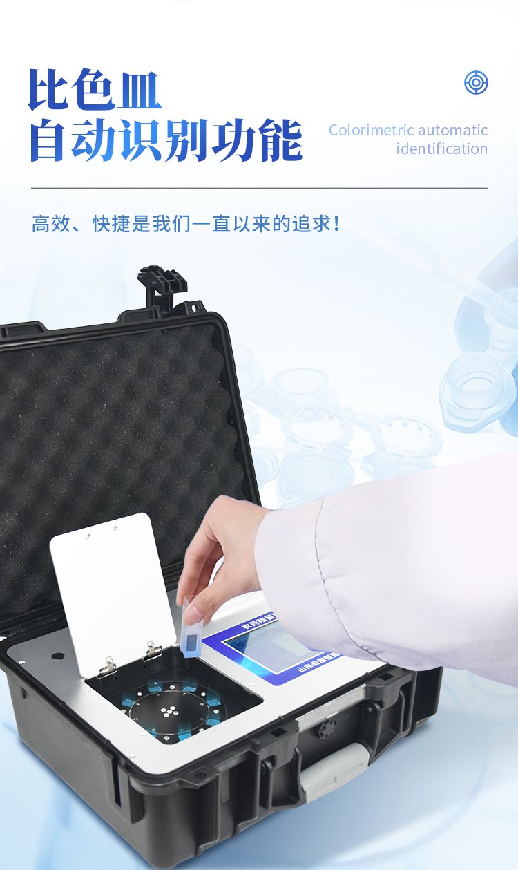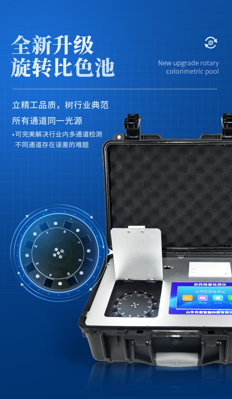 | 機(jī)器采用全新安卓智能系統(tǒng),主控芯片采用 ARM Cortex-A7,RK3288/4核處理器,主頻1.88Ghz,運(yùn)轉(zhuǎn)速度更快速,穩(wěn)定性更強(qiáng)。 | 創(chuàng)新檢測模式: *儀器采用精密旋轉(zhuǎn)比色池設(shè)計(jì),使用光源一致,可以解決各通道間由于光源誤差帶來的檢測結(jié)果誤差問題,檢測結(jié)果更加精準(zhǔn)。 *儀器具有自動(dòng)識別比色皿檢測功能,即:將樣品比色皿放入儀器后,點(diǎn)擊樣品檢測,儀器自動(dòng)識別比色皿進(jìn)行通道檢測。 | 供電方式:交直流兩用,直流 12V 供電,可連接車載電源,可配 6ah 大容量充電鋰電池,方便戶外流動(dòng)測試。 | 顯示方式:7英寸液晶觸摸屏顯示,人性化中文操作界面,讀數(shù)直觀、簡單。 | 檢測通道:12個(gè)檢測通道,可以同時(shí)測試多個(gè)樣品,循環(huán)檢測,即放即檢,每個(gè)樣品由程序控制分別獨(dú)立工作,不會互相干擾。 | 高精光源系統(tǒng): ①儀器光源采用進(jìn)口超高亮發(fā)光二極管,光源亮度可以自動(dòng)調(diào)節(jié)與校準(zhǔn) ②智能恒流穩(wěn)壓,光強(qiáng)自動(dòng)校準(zhǔn),長時(shí)間連續(xù)工作光源無溫漂現(xiàn)象。 | 智能操作分析系統(tǒng): ①儀器具有100多種蔬菜名稱菜單庫,分類管理,并可按需添加或刪除、編輯蔬菜名稱;可在同一檢測界面自動(dòng)對應(yīng)相關(guān)檢測通道一次性選擇1-24個(gè)樣品名稱,無需退出界面,節(jié)省操作時(shí)間。 ②內(nèi)置新國家限量標(biāo)準(zhǔn),與所測結(jié)果進(jìn)行現(xiàn)場比對,并持續(xù)更新標(biāo)準(zhǔn)。 | 完善的配套硬件: ①采用串口5v打印機(jī),可選擇手動(dòng)打印或者自動(dòng)打印,三分鐘出打印結(jié)果,打印格式為檢測人姓名、吸光度差值、檢測時(shí)間、檢測機(jī)構(gòu)、樣品名稱及結(jié)果判定。 ②儀器具有無線上傳模塊,檢測結(jié)果可批量打印,批量上傳。 | 數(shù)據(jù)調(diào)用: ①儀器可存儲20萬條檢測結(jié)果, ②檢測結(jié)果為Excel表格,方便后期進(jìn)行數(shù)據(jù)分析與匯總報(bào)告 ③儀器采用USB2.0接口設(shè)計(jì),支持 U 盤存儲,方便數(shù)據(jù)的存貯和移動(dòng),并可隨時(shí)與計(jì)算機(jī)直接相連,實(shí)現(xiàn)數(shù)據(jù)查詢、瀏覽、分析、統(tǒng)計(jì)、打印等。 | 后期產(chǎn)品固件可升級。 | 安全證書,放心保障:儀器具有中國計(jì)量科學(xué)研究院校準(zhǔn)證書,權(quán)威認(rèn)證,使用放心。 | 機(jī)箱采用工業(yè)級ABS工程塑料箱,方便攜帶,穩(wěn)固耐用,便于流動(dòng)測試。 |