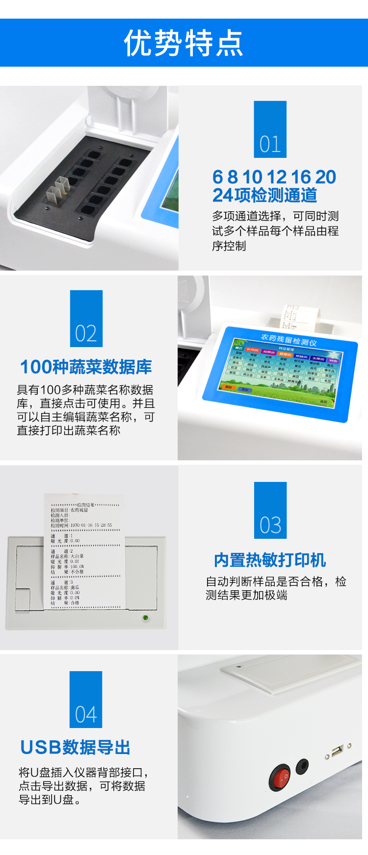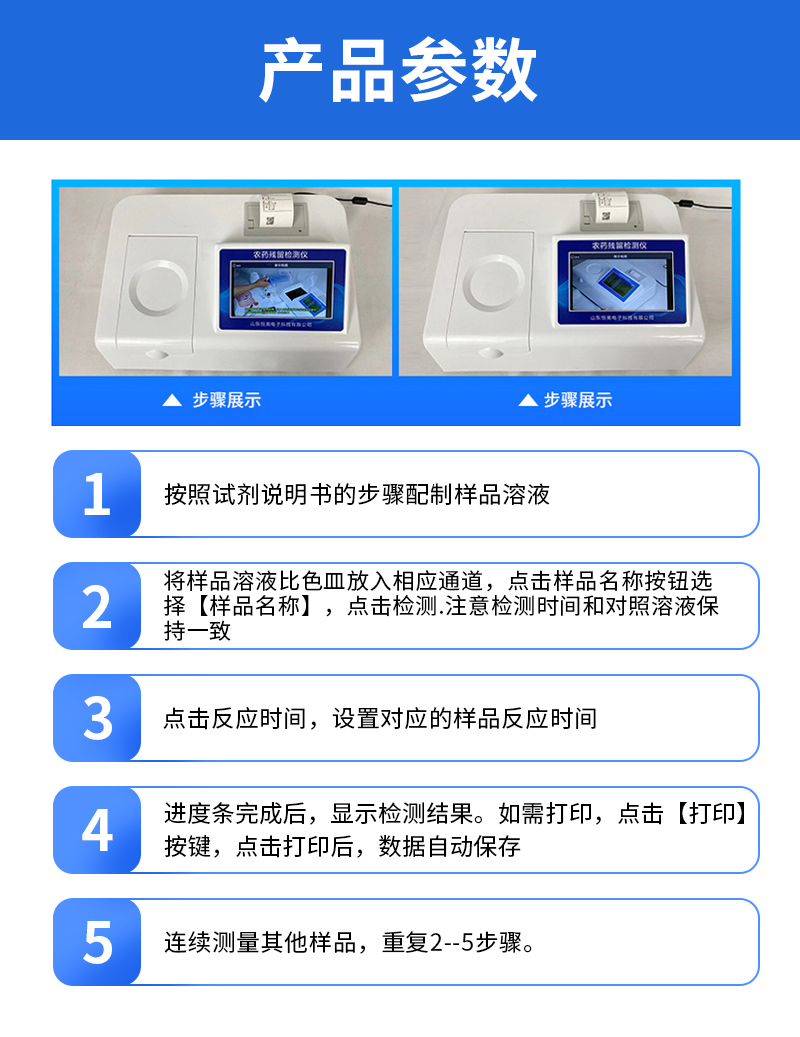 | 乙酰膽堿酯酶和丁酰膽堿酯酶試劑均可以使用,符合國家標(biāo)準(zhǔn)和農(nóng)業(yè)部標(biāo)準(zhǔn)的要求。 | 自動判斷樣品是否合格,檢測結(jié)果更加直觀。 | 儀器具有100多種蔬菜名稱菜單庫,分類管理,并可按需添加或刪除蔬菜名,編輯蔬菜名稱,可直接打印出蔬菜名稱。 | 檢測通道:10個檢測通道,可以同時測試多個樣品,循環(huán)檢測,即放即檢,每個樣品由程序控制分別獨立工作,不會互相干擾。 | 智能操作系統(tǒng),采用更加人性化操作,主控采用多核處理器,主頻1.88Ghz,運轉(zhuǎn)速度更快速,穩(wěn)定性更強。 | 顯示方式:7英寸高靈敏真彩觸摸屏顯示,人性化中文操作界面,讀數(shù)直觀、簡單。 | 打印機(jī)采用串口5v打印,可選擇手動打印或者自動打印,三分鐘出打印結(jié)果,打印格式為檢測人姓名、吸光度差值、檢測時間、檢測機(jī)構(gòu)、樣品名稱及結(jié)果判定。 | 光源采用進(jìn)口超高亮發(fā)光二極管,具有低功耗、高精度、穩(wěn)定性強、光源可控可以關(guān)掉不使用的光源,響應(yīng)速度快等優(yōu)點。 | 智能恒流穩(wěn)壓,光強自動校準(zhǔn),長時間連續(xù)工作光源無溫漂現(xiàn)象。 | 儀器具有GPRS遠(yuǎn)傳功能,可插手機(jī)卡實現(xiàn)數(shù)據(jù)遠(yuǎn)傳平臺,wifi聯(lián)網(wǎng)功能,可將數(shù)據(jù)快速上傳電腦,進(jìn)行數(shù)據(jù)管理與統(tǒng)計。 | 采用USB2.0接口設(shè)計,方便數(shù)據(jù)的存貯和移動,并可隨時與計算機(jī)直接相連,并且可用計算機(jī)控制儀器。實現(xiàn)數(shù)據(jù)查詢、瀏覽、分析、統(tǒng)計、打印等。 | 智能化程度高,儀器具有自檢功能:具有開機(jī)自檢和調(diào)零功能,具有自動檢測重復(fù)性功能 | 儀器具有自身保護(hù)功能,可設(shè)置用戶名及密碼,防止非工作人員操作等。 | 采用DC12v直流供電,安全系統(tǒng)更高,并且配備6A鋰電池充電器。 | 儀器具有重新校準(zhǔn)、鎖定、恢復(fù)出廠設(shè)置功能。 |