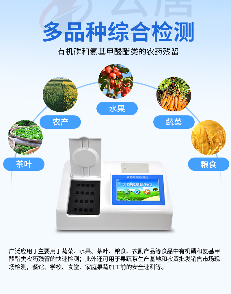 廣泛應(yīng)用于主要用于蔬菜、水果、茶葉、糧食、農(nóng)副產(chǎn)品等食品中有機(jī)磷和氨基甲酸酯類農(nóng)藥殘留的快速檢測;此外還可用于果蔬茶生產(chǎn)基地和農(nóng)貿(mào)批發(fā)銷售市場現(xiàn)場檢測,餐館、學(xué)校、食堂、家庭果蔬加工前的安全速測等。