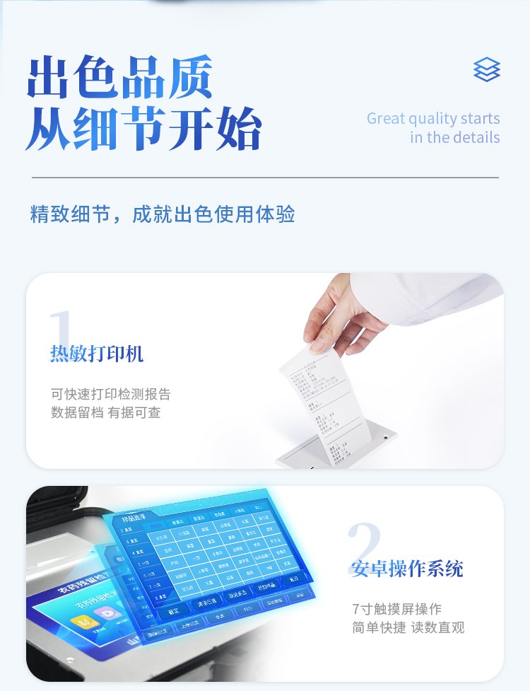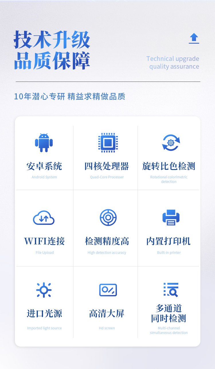 | 機器采用全新安卓智能系統,主控芯片采用 ARM Cortex-A7,RK3288/4核處理器,主頻1.88Ghz,運轉速度更快速,穩定性更強。 | 創新檢測模式: *儀器采用精密旋轉比色池設計,使用光源一致,可以解決各通道間由于光源誤差帶來的檢測結果誤差問題,檢測結果更加精準。 *儀器具有自動識別比色皿檢測功能,即:將樣品比色皿放入儀器后,點擊樣品檢測,儀器自動識別比色皿進行通道檢測。 | 供電方式:交直流兩用,直流 12V 供電,可連接車載電源,可配 6ah 大容量充電鋰電池,方便戶外流動測試。 | 顯示方式:7英寸液晶觸摸屏顯示,人性化中文操作界面,讀數直觀、簡單。 | 檢測通道:8個檢測通道,可以同時測試多個樣品,循環檢測,即放即檢,每個樣品由程序控制分別獨立工作,不會互相干擾。 | 高精光源系統: ①①儀器光源采用進口超高亮發光二極管,光源亮度可以自動調節與校準 ②智能恒流穩壓,光強自動校準,長時間連續工作光源無溫漂現象。 | 智能操作分析系統: ①儀器具有100多種蔬菜名稱菜單庫,分類管理,并可按需添加或刪除、編輯蔬菜名稱;可在同一檢測界面自動對應相關檢測通道一次性選擇1-24個樣品名稱,無需退出界面,節省操作時間。 ②內置新國家限量標準,與所測結果進行現場比對,并持續更新標準。 | 完善的配套硬件: ①采用串口5v打印機,可選擇手動打印或者自動打印,三分鐘出打印結果,打印格式為檢測人姓名、吸光度差值、檢測時間、檢測機構、樣品名稱及結果判定。 ②儀器具有無線上傳模塊,檢測結果可批量打印,批量上傳。 | 數據調用: ①儀器可存儲20萬條檢測結果, ②檢測結果為Excel表格,方便后期進行數據分析與匯總報告 ③儀器采用USB2.0接口設計,支持 U 盤存儲,方便數據的存貯和移動,并可隨時與計算機直接相連,實現數據查詢、瀏覽、分析、統計、打印等。 | 后期產品固件可升級。 | 安全證書,放心保障:儀器具有中國計量科學研究院校準證書,權威認證,使用放心。 |