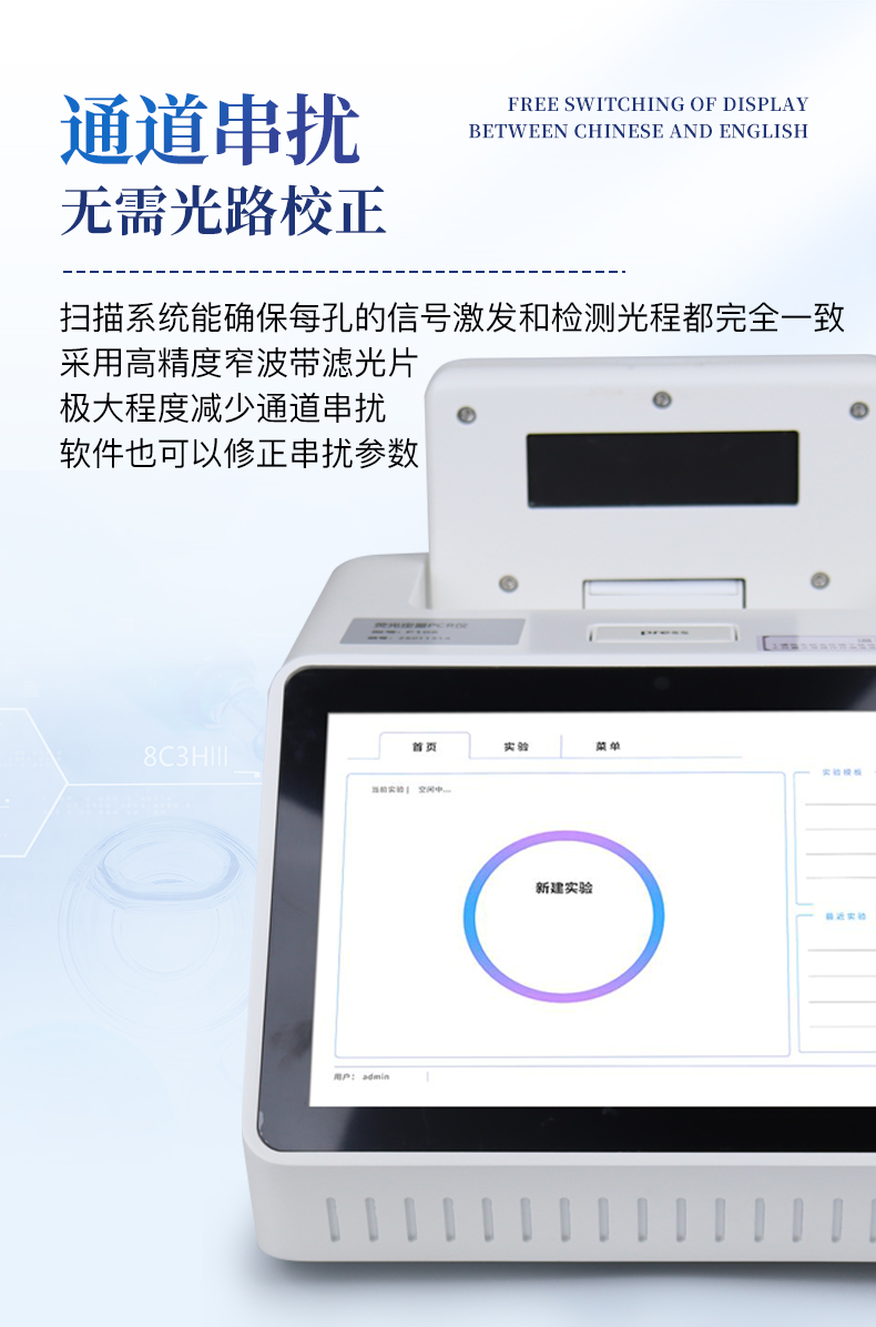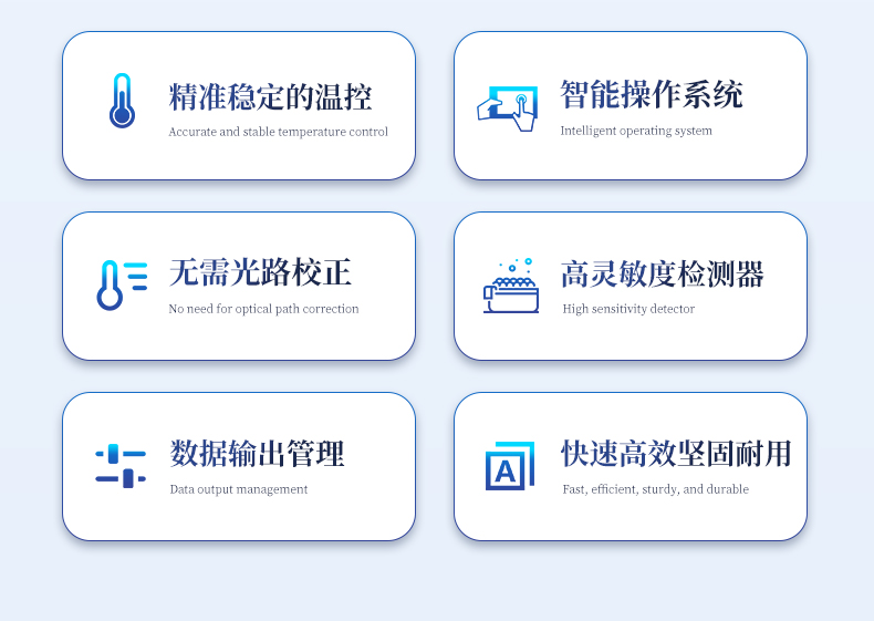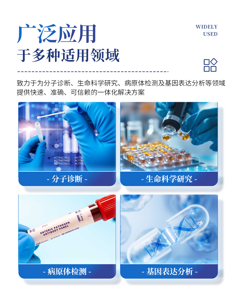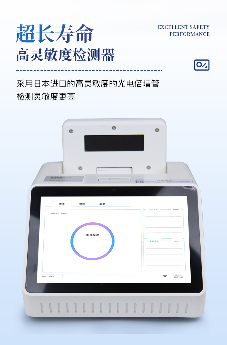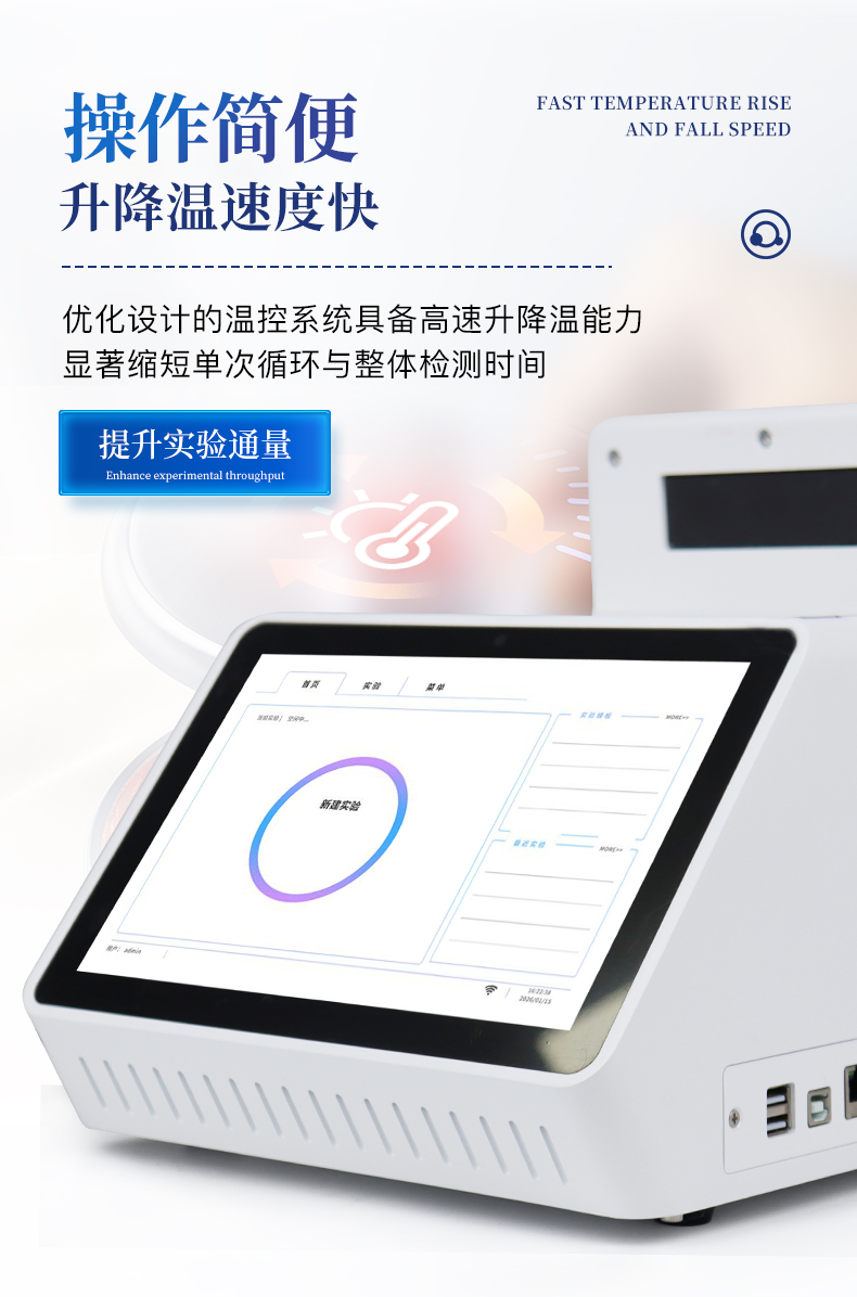 | 1.智能操作系統,實驗盡在掌握 | A雙模式靈活控制:支持通過儀器觸摸屏獨立運行,也支持通過電腦軟件進行遠程控制與數據管理,適應不同實驗場景需求。 | B程序更新與預設:支持在線更新實驗程序,并內置豐富的預設實驗程序模板,用戶亦可自定義保存常用模版,實現一鍵快速啟動,極大提升操作效率。 | C極簡啟動體驗(可選配):可定制集成攝像頭掃描系統,用戶只需掃描樣品板或程序卡的二維碼,即可自動識別并調用對應實驗程序,簡化流程,避免人為設置錯誤。 | D操作簡單:無論是觸摸屏界面還是電腦軟件,均設計得直觀易懂,新用戶也能快速上手。預置常用程序模板,進一步簡化操作流程。 | 2.精準穩定的溫控與光學核心 | A長久精準的溫控系統:采用進口***TEC半導體制冷模塊,控溫精準(±0.1°C),孔間溫度均勻性**(≤±0.3°C)。系統穩定性卓越,長期使用性能衰減小,校準周期長達數年,顯著降低維護成本與運營中斷。 | B免維護的靈敏光學系統:配備4個獨立LED光源與4個獨立光電二極管檢測器,實現四通道熒光同步精準檢測。采用超長壽命進口光源,設計壽命期內免維護,無需額外校準或更換,保障檢測結果長期一致性與高靈敏度。 | C卓越的數據質量:實驗線性相關性高(R2≥0.999),重復性優異(孔間CV值低),確保定量結果準確可靠,數據置信度高。 | 3.**便捷的數據與輸出管理 | A多重數據導出方式:支持通過USB存儲設備直接拷貝,或經由Wi-Fi無線網絡傳輸數據至本地服務器或云端,方便靈活,滿足各類實驗室數據管理習慣。 | B豐富的報告導出與打?。褐С稚刹С龆喾N格式(如PDF、Excel)的實驗報告。儀器兼容USB熱敏打印機、藍牙無線打印機及常規A4打印機,可直接在儀器上或通過電腦一鍵導出并打印專業報告,便于結果存檔與即時分享。 | 4.快速**與堅固耐用 | A升降溫速度快:優化設計的溫控系統具備高速升降溫能力,顯著縮短單次循環與整體檢測時間,提升實驗通量。 | B超長使用壽命:核心部件均選用工業級耐用材料與設計,整機運行穩定可靠,致力于為用戶提供長久的投資回報。 | 三、應用場景基礎科學研究、病原體檢測、肉制品摻假、轉基因檢測、食品安全檢測、藥物開發及合理用藥、基因表達、水體監測、松材線蟲檢測、寵物檢測、養殖業疫病檢測 |