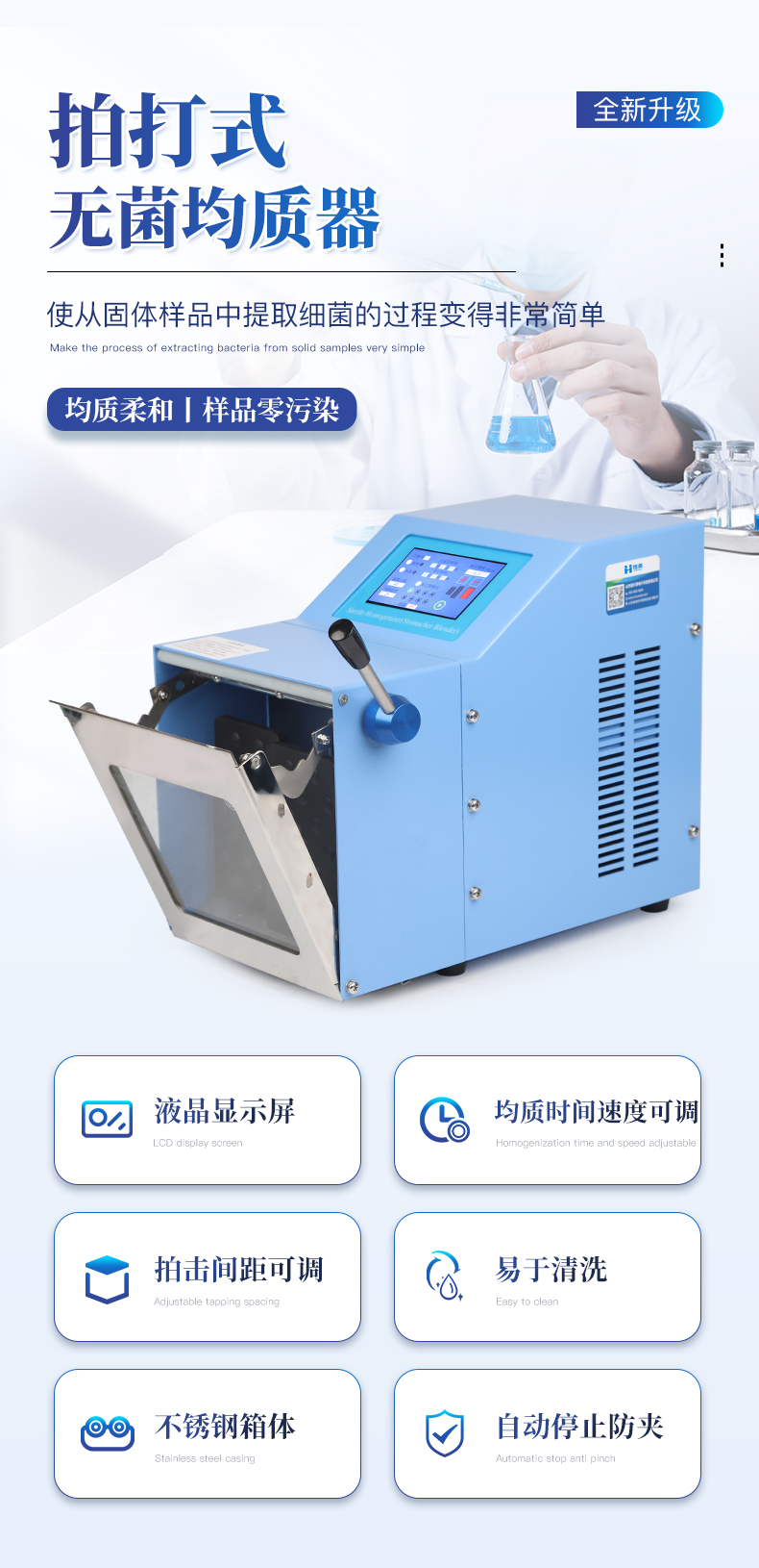 應(yīng)用領(lǐng)域:食品微生物分析;動(dòng)物組織、生物樣品、化妝品的均質(zhì)處理;肉、魚、蔬菜、水果、餅干;藥品的微生物分析等;