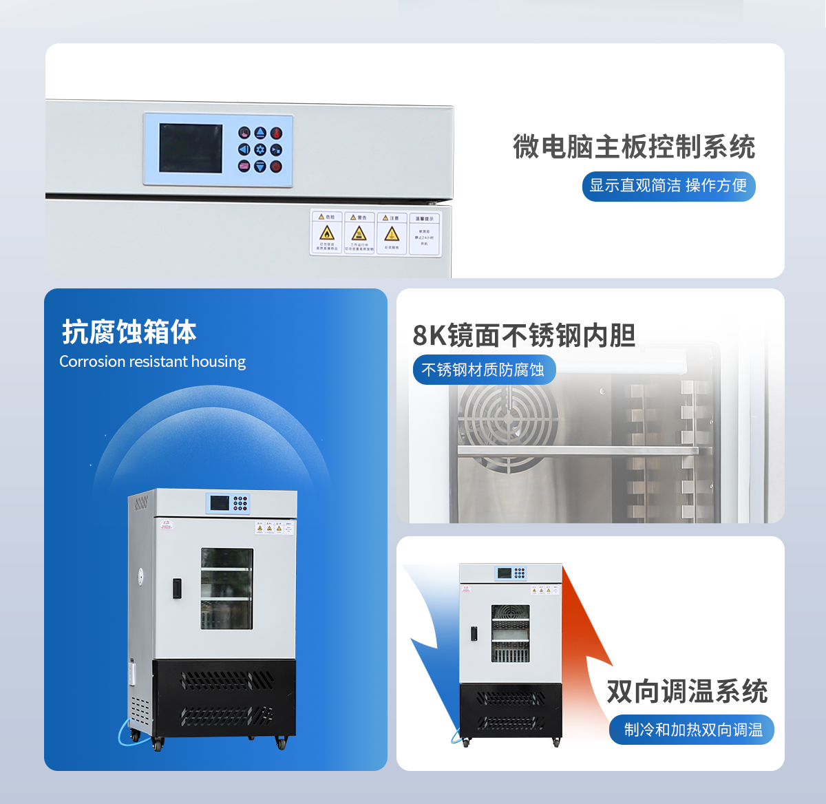 | 工作容積:250L | 箱內照明:日光燈 | 控溫范圍:0-70℃(設定溫度≤10℃時環境溫度要低于30℃) | 程序控制:24段 | 溫度分辨率:0.1℃ | 溫度波動度:±0.5℃ | 控濕范圍:30%-95% | 定時范圍:0-99小時59分鐘 | 加熱功率:900W | 內箱尺寸 寬*深*高(cm):51*48*96 | 外箱尺寸 寬*深*高(cm):64*70*152 | 隔板層數(標配):2層 | 層間隔/mm:36 | 卡槽層數:13 | 加濕器容量(標配):3L | 單層隔板承重:<15kg | 底部總承重:30kg | 電壓:AC220V 50HZ | 整機重量:96kg | 內膽材質:不銹鋼材質 | 箱體材質:冷軋鋼板表面采用抗腐蝕高溫噴塑工藝 |
