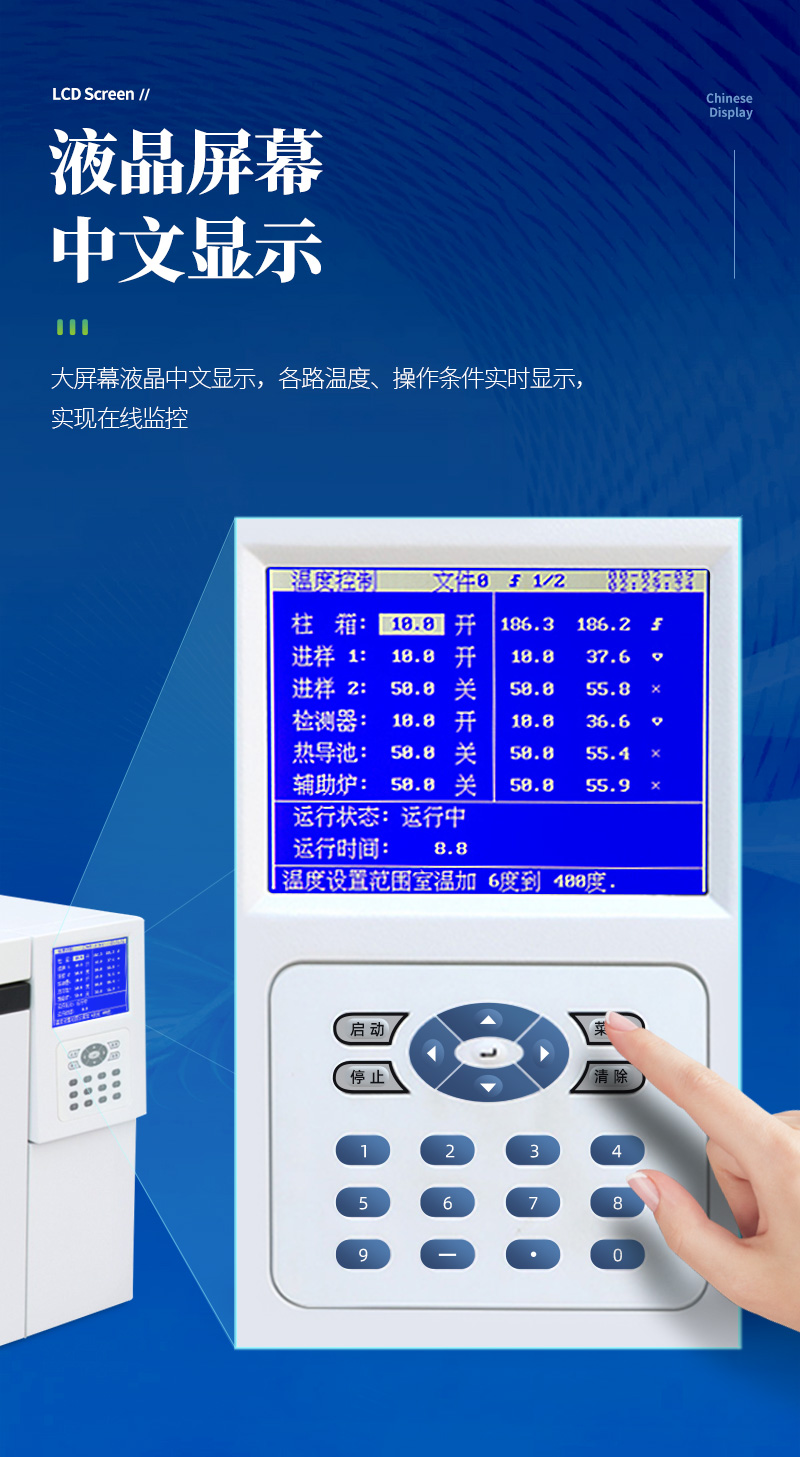 ● 中、英文切換顯示技術,5.7寸液晶大屏幕(320*240)。多達20個顯示界面,信息量豐富,可儲存20套色譜分析數據,并可隨時調用。
