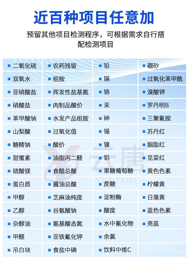 可快速檢測各類食品中的甲醛、二氧化硫、亞硝酸鹽的含量,儀器預留其他項目檢測程序和端口,根據日后需求可方便的自主增加檢測項目。