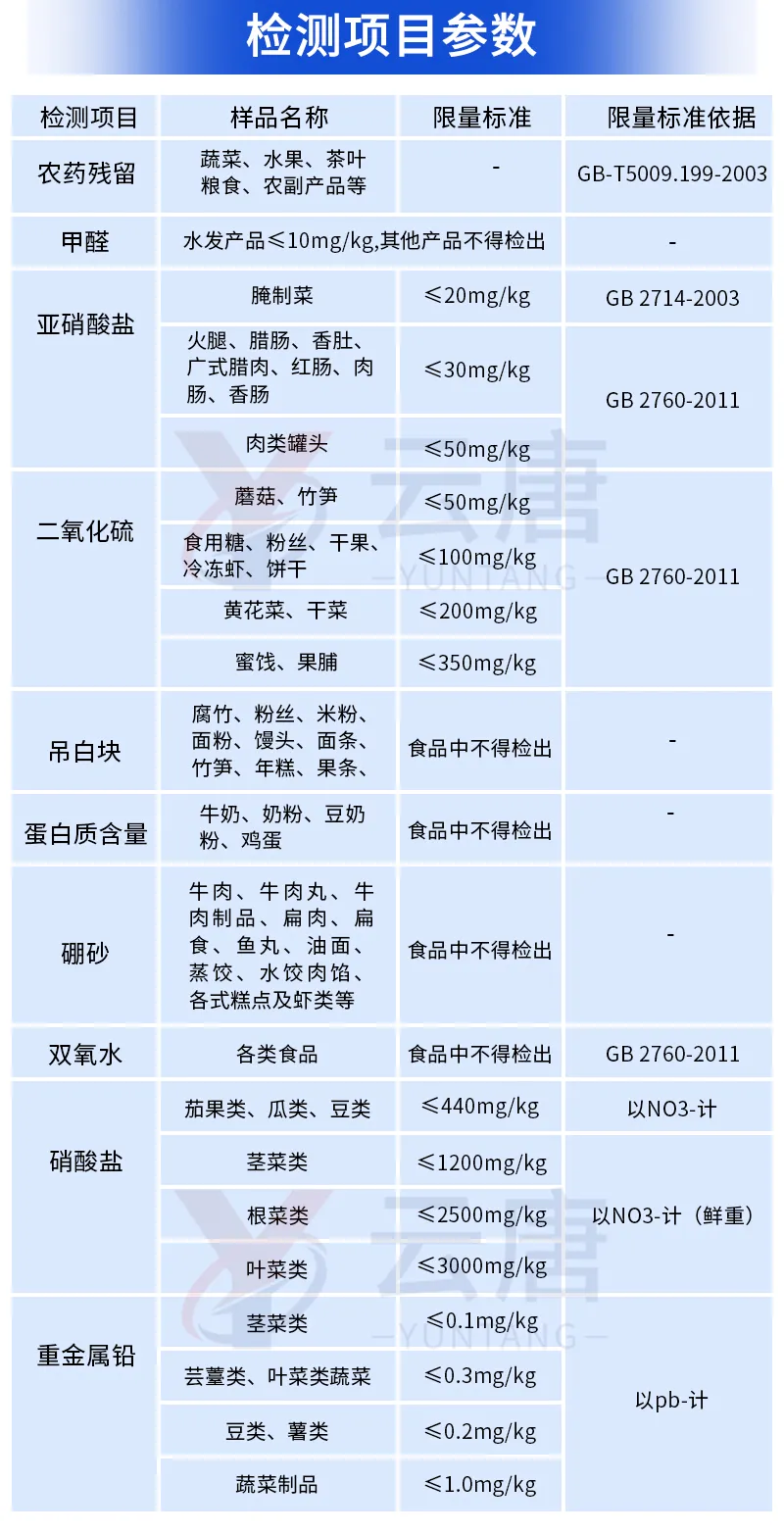 果蔬中:農(nóng)藥殘留,病害肉診斷:組胺、揮發(fā)性鹽基氮、肉制品酸價(jià)、水發(fā)產(chǎn)品中組胺