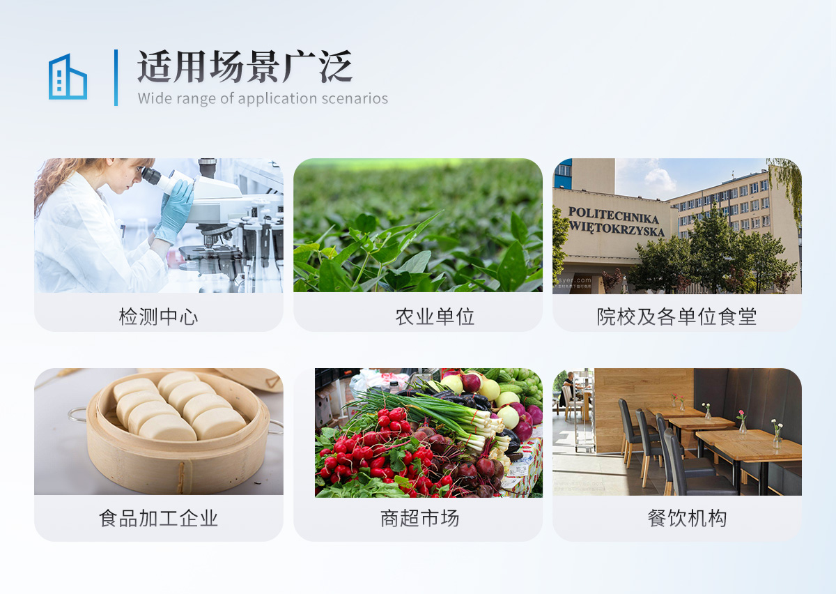 廣泛應用于食品深加工企業、食藥監局、商場超市、質量監督檢驗、工商管理、餐飲檢測、各大食品安全監測系統等單位使用。