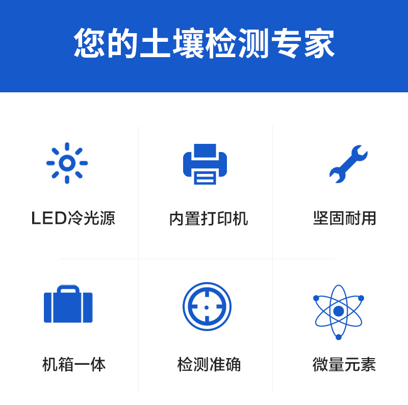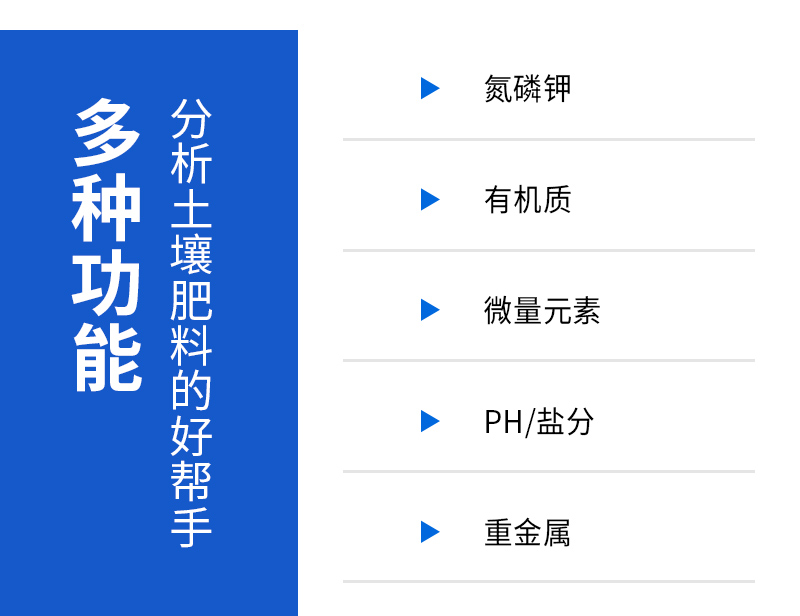 4、可檢測土壤及化肥、有機肥、植株中的速效氮、有效磷、速效鉀、全氮、全磷、全鉀、有機質含量,土壤酸堿度,含鹽量,以及土壤鈣、鎂、硫、硼、氯、硅等6種中微量元素。