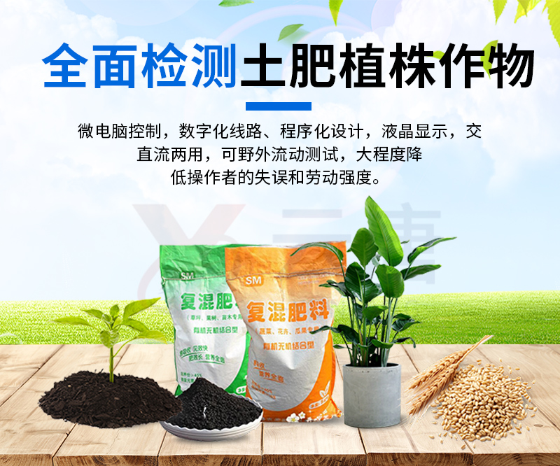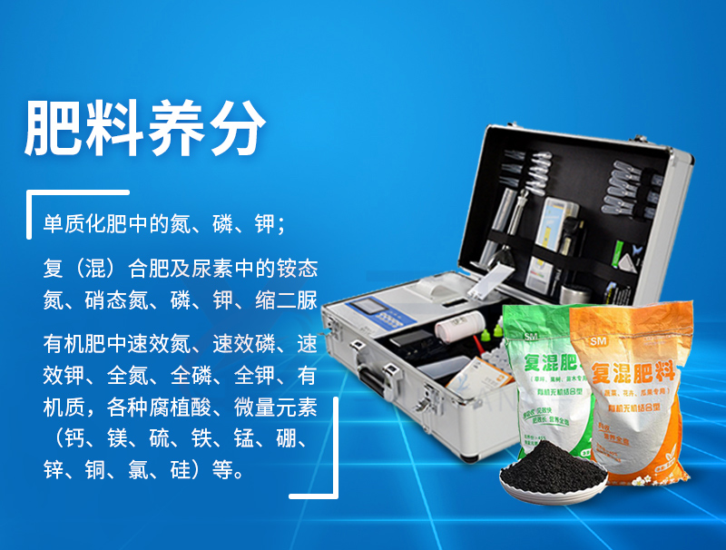 肥料養分:● 單質化肥中的氮、磷、鉀; ● 復(混)合肥及尿素中的銨態氮、磷、鉀; ● 有機肥中速效氮、速效磷、速效鉀、全氮、全磷、全鉀、pH、有機質等。