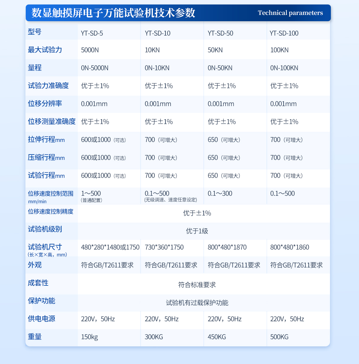 | 1、 **試驗力:5000N ; | 2、 量 程:0N-5000N; | 3、 試驗力準確度:優于±1% | 4、 位移分辨率:0.001mm; | 5、 位移測量準確度:優于±1%; | 6、 拉伸行程:600mm或1000mm(可選) | 7、 壓縮行程:600mm或1000mm(可選) | 8、 試驗行程:600mm或1000mm(可選) | 9、 位移速度控制范圍:1mm/min~500mm/min(普通配置) | 10、位移速度控制精度:優于±1%; | 11、試驗機級別:優于1級 | 12、試驗機尺寸:480*280*1480或1750 mm | 13、外觀:符合GB/T2611要求 | 14、成套性:符合標準要求 | 15、保護功能:試驗機有過載保護功能 | 16、供電電源:220V,50Hz | 17、重量:150kg |