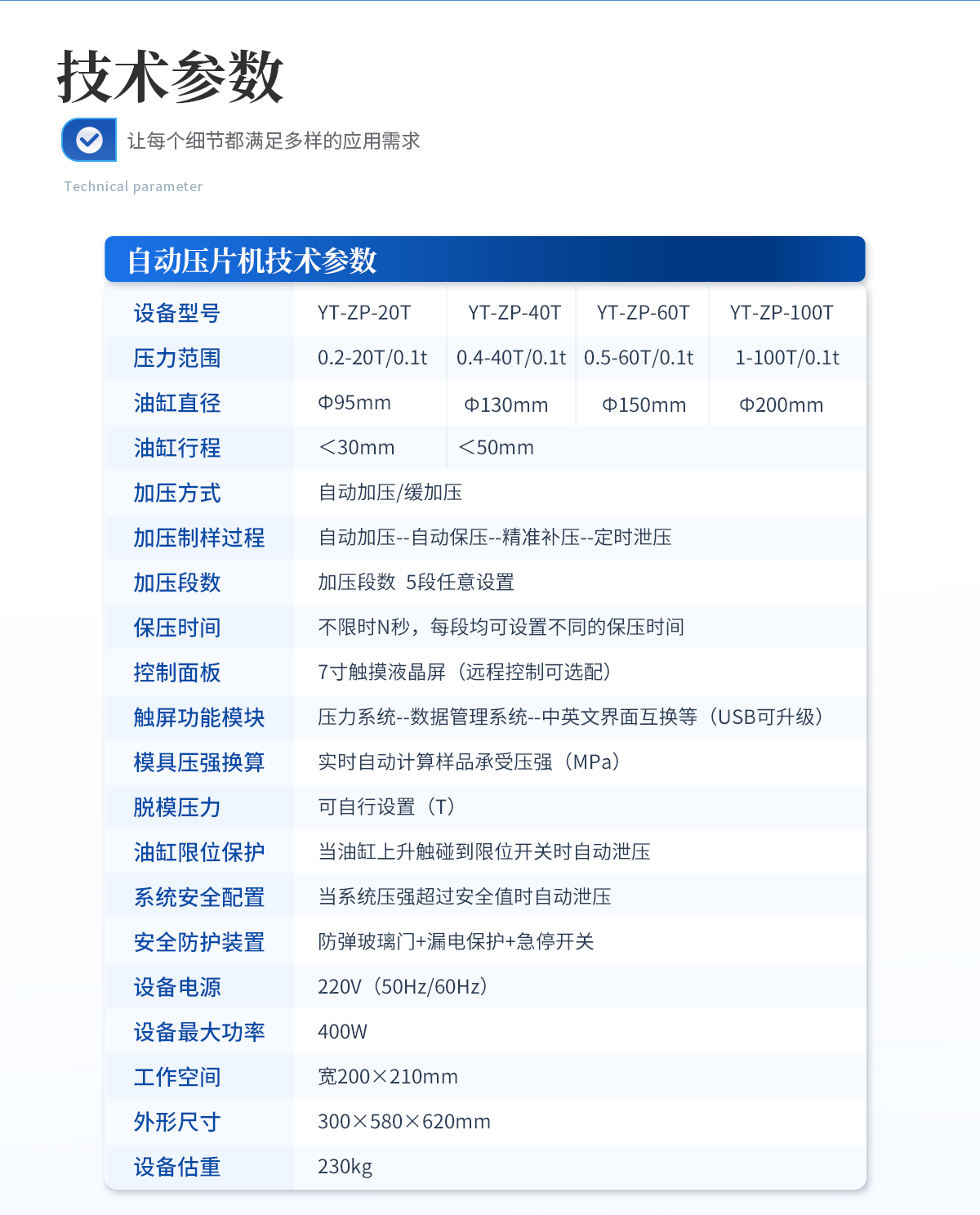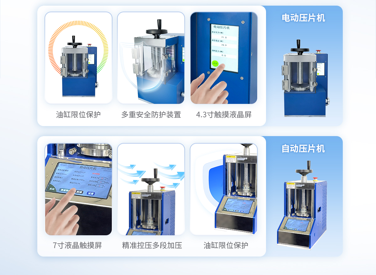 | 設備型號:YT-ZP-40T | 壓力范圍:0.4-40T/0.1t | 油缸直徑:Ф130mm | 油缸行程 :<50mm | 加壓方式:自動加壓/緩加壓 | 加壓制樣過程:自動加壓--自動保壓--精準補壓--定時泄壓 | 加壓段數:5段任意設置 | 保壓時間:不限時N秒,每段均可設置不同的保壓時間 | 控制面板:XNNETS 7寸 觸摸液晶屏(遠程控制可選配) | 觸屏功能模塊:壓力系統--數據管理系統--中英文界面互換等(USB可升級) | 模具壓強換算:實時自動計算樣品承受壓強(MPa) | 脫模壓力:可自行設置(T) | 油缸限位保護:當油缸上升觸碰到限位開關時自動泄壓 | 系統安全配置:當系統壓強超過安全值時自動泄壓 | 安全防護裝置:防彈玻璃門+漏電保護+急停開關 | 設備電源:220V(50Hz/60Hz) | 設備**功率:400W | 工作空間:寬160×180mm | 外形尺寸 :280×460×550mm | 設備估重 :110kg | 配置說明:壓片機1臺,模具選配!可根據需求定制壓片機或模具 |