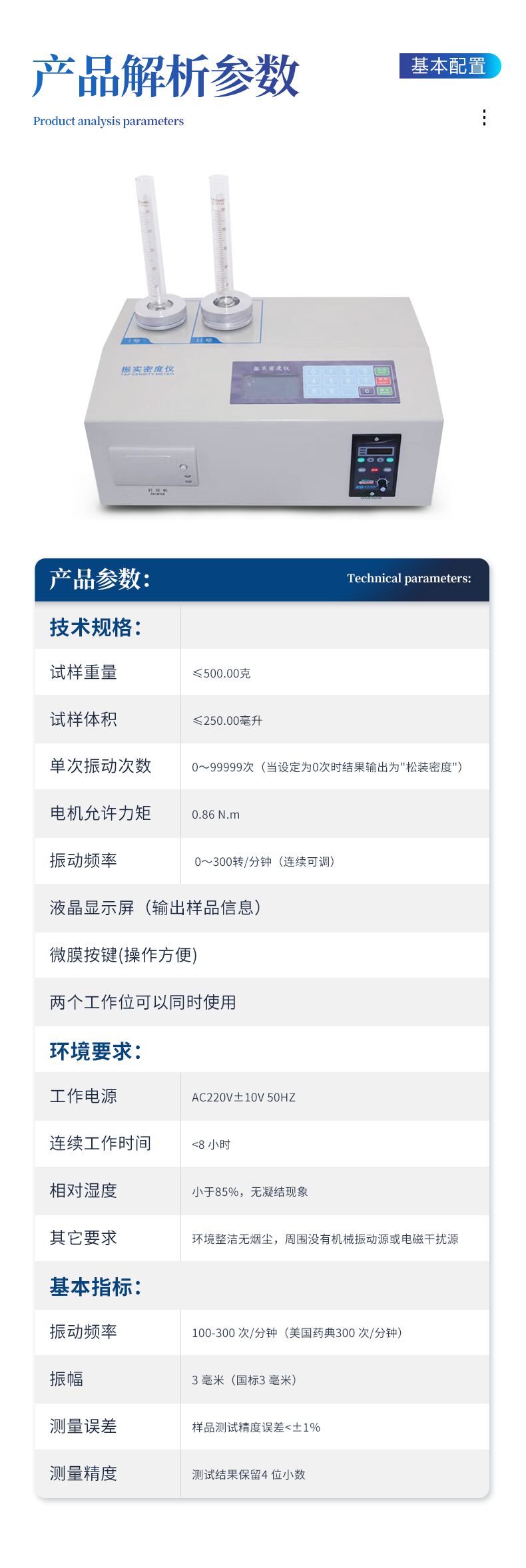 | 試樣重量:≤500.00克; | 試樣體積:≤250.00毫升; | 單次振動(dòng)次數(shù):0~99999次(當(dāng)設(shè)定為0次時(shí)結(jié)果輸出為"松裝密度"); | 電機(jī)允許力矩:0.86 N.m; | 振動(dòng)頻率: 0~300轉(zhuǎn)/分鐘(連續(xù)可調(diào)); | 液晶顯示屏(輸出樣品信息); | 微膜按鍵(操作方便) | 兩個(gè)工作位可以同時(shí)使用 | 振動(dòng)幅度:3mm,(可調(diào)) | ZS2高精度振實(shí)密度儀是專門針對(duì)固體粉體密度的測(cè)量?jī)x器,按照國(guó)家標(biāo)準(zhǔn)GB/T 5162-2006/ISO3953:1993,參照美國(guó)藥典標(biāo)準(zhǔn)研發(fā)制造。廣泛應(yīng)用于工業(yè)、電池材料、藥品材料、奶制品、磨料、造紙、水泥、涂料、科研機(jī)構(gòu)、大中專院校以及各種金屬和非金屬行業(yè)。 |